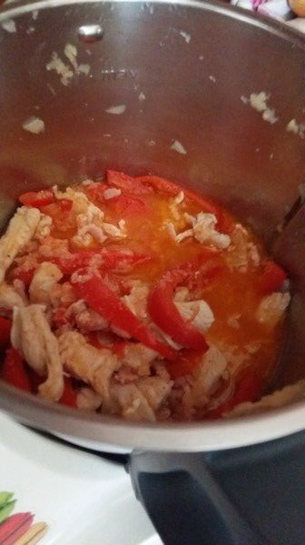 - Ajouter les émincés de poulet, les lardons, la tomate coupée en quartier, le poivre puis faire chauffer 10min/90°C/mijotage, à la sonnerie mélanger avec la spatule puis continuer la cuisson 2 min/90°C/mijotage.