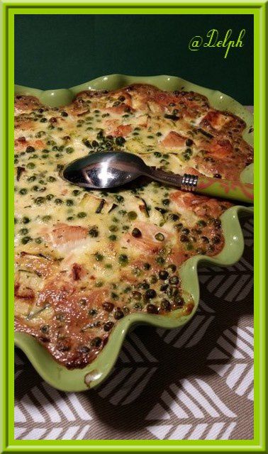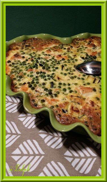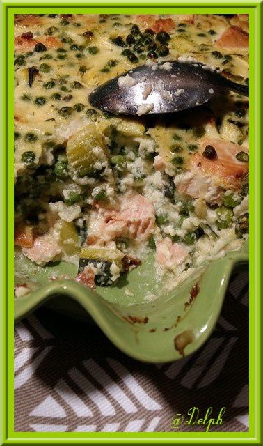 - Découper le saumon en cubes de 3 cm, répartir tous les ingrédients (courgettes, petits pois) dans un plat à gratin beurré et fariné.