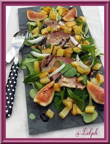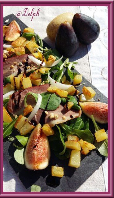 - Laver avec un linge humide votre figue, la couper en 4 et la placer sur votre assiette, parsemer de petits croûtons, puis poser vos pommes de terres rissolées.