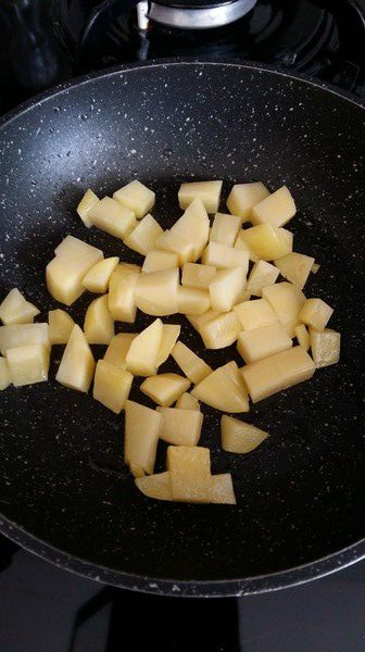 - Éplucher la pomme de terre et la couper en dés, les faire revenir dans une poêle avec un peu d’huile pendant un quinzaine de minutes.
