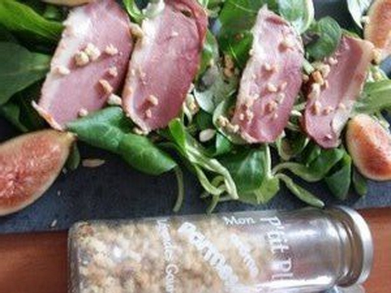 - Préparer votre mâche en la mélangeant à de l’huile d’olive et du vinaigre, la mettre sur votre assiette de présentation, saupoudrer de graines pour salade, mettre vos tranches de filets de canard, avec quelques tranches fines d’oignon.