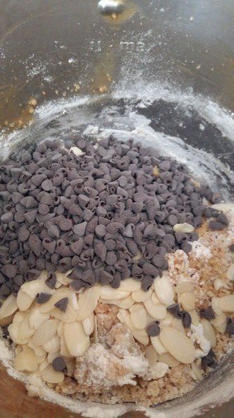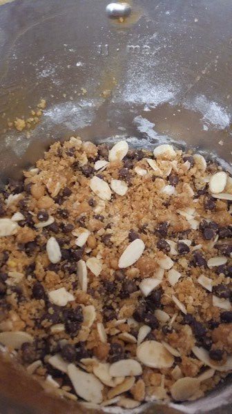 - Ajouter les amandes effilées et les pépites de chocolat, mélanger 50sec/Vit2/couteau inversé. Votre pâte est très friable c’est normal.