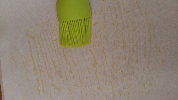- Pour préparer les papillotes, découper 8 feuilles de papier sulfurisé et les superposer deux par deux. Badigeonner la feuille du haut d’huile d’olive à l’aide d’un pinceau.