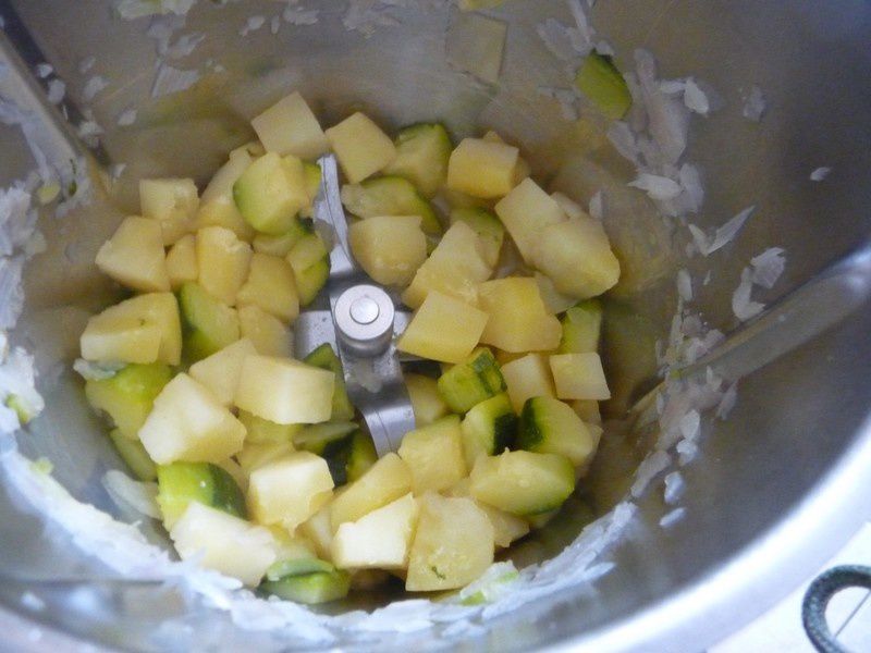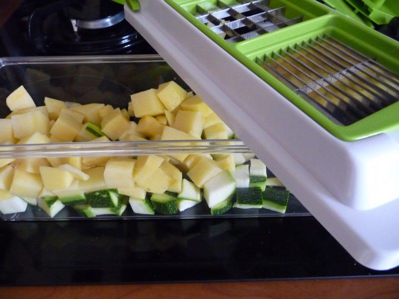 - Laver la courgette. Éplucher la pomme-de-terre et les découper en cubes. J’utilise un taille légumes