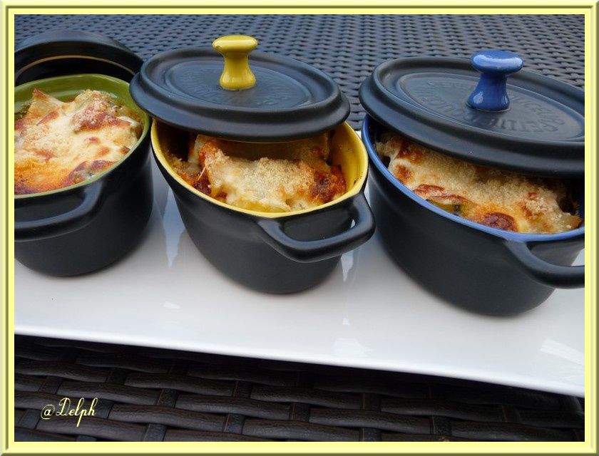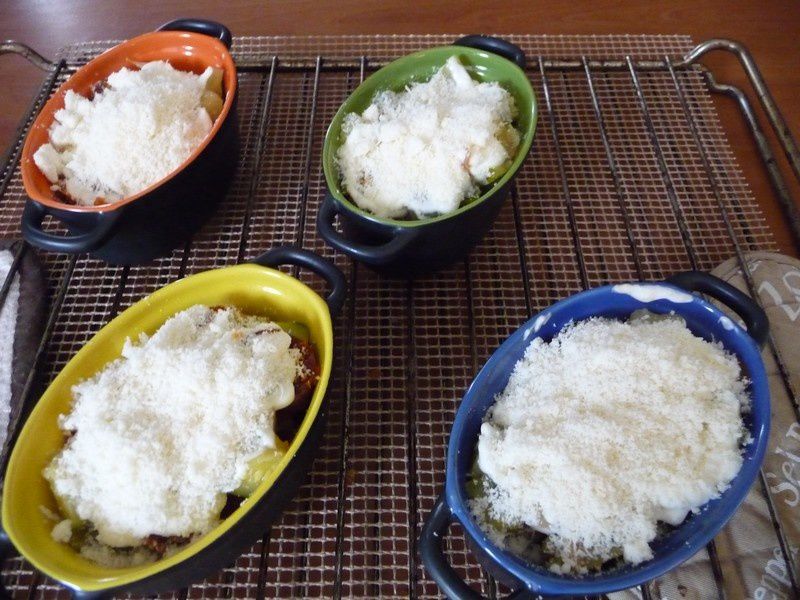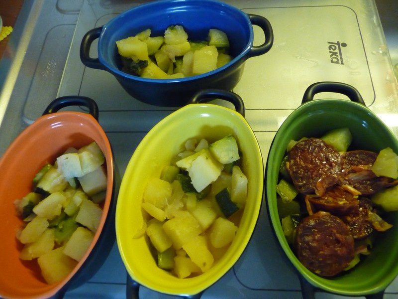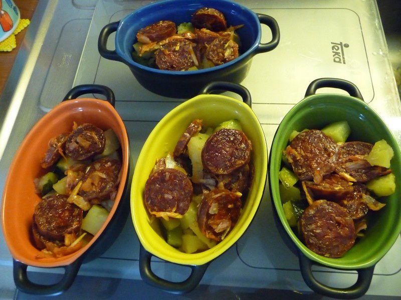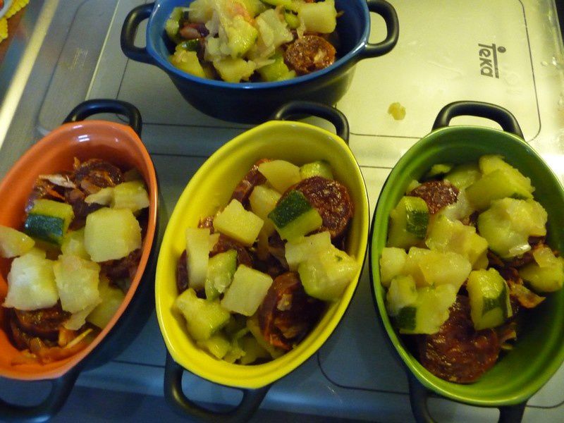 - Déposer une partie des légumes dans des cocottes, mettre les tranches de chorizo par-dessus, finir par le reste de légumes, puis mettre 1 grosse cuillère à café de crème sur la dernière couche de légumes, recouvrir de parmesan râpé.