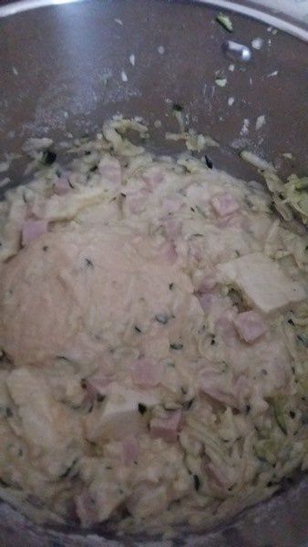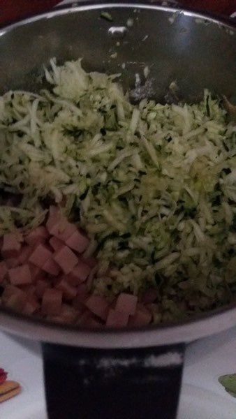 - Incorporer la moutarde, la mozzarella en dés, la courgette égouttée et épongée et les dés de jambon. Saler, poivrer et mélanger 35sec/Vit3/couteau inversé.