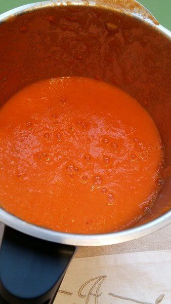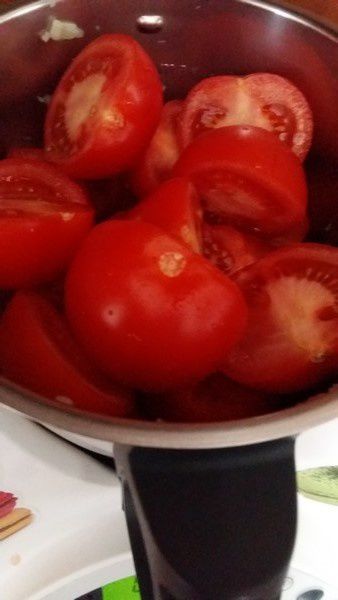 - Ajouter les poivrons en lamelles, l’ail , les tomates en morceaux et l’eau puis programmer 18min/Varoma/Mijotage.