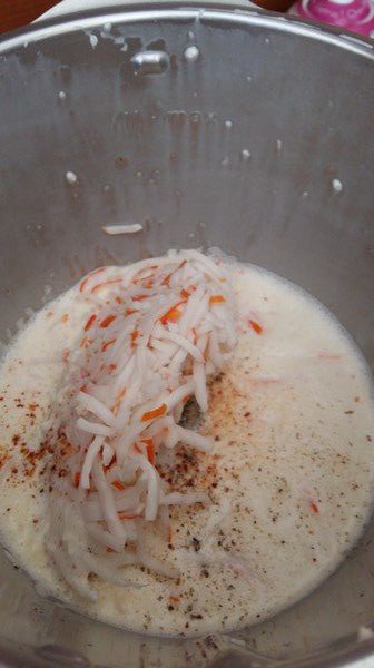 - Mettre dans les bol vos oignons nettoyés, enlever le vert tendre et mixer 5sec/Vit5, ajouter les œufs avec la crème liquide et mélanger 15sec/vit4, ajouter les miettes de crabe, un pincée de piment d’Espelette, le sel et le poivre puis mélanger à nouveau 10sec/Vit2/couteau inversé.