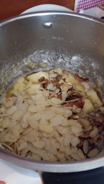 - Peler, ôter le trognon et couper en de tout petits morceaux la pomme. Ajoutez-la à la préparation avec le cidre, les noix et les amandes puis mélanger 20sec/Vit2/couteau inversé. (Vous pouvez enlever le couteau inversé si vous ne souhaitez pas avoir le croquant des noix et mixer un peu plus, moi je préfère avec le croquant).