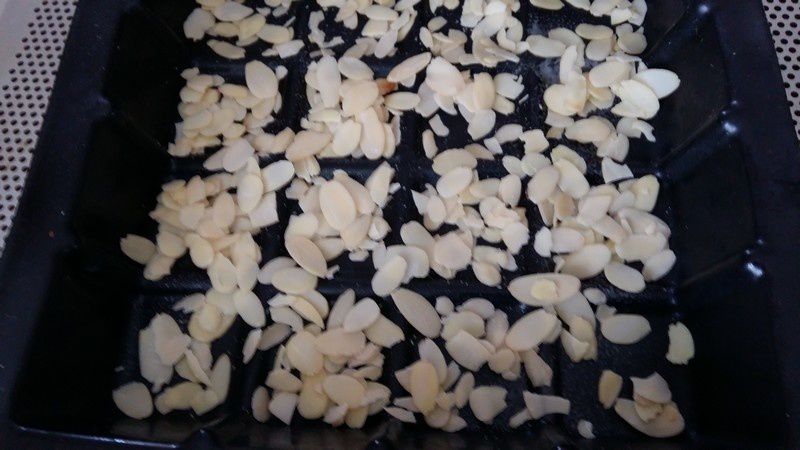 - Beurrer un moule carré ou un moule à cake, j’ai parsemé le fond de mon moule d’amandes effilées pour plus de gourmandise, puis verser votre préparation. Enfourner pendant 10 minutes à 140°C puis monter la température à 180°C pendant encore 20 minutes. Vérifier alors la cuisson de votre gâteau et sortez-le du four. Laisser refroidir avant de démouler.