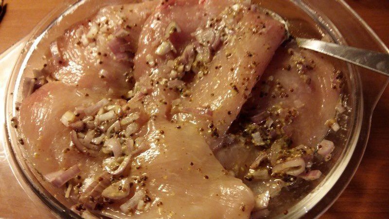 2. Dans un plat creux mélanger l’huile, la moutarde et l’échalote, saler, poivrer et mettre les filets de poulet à mariner au frigo pendant 1 heure.