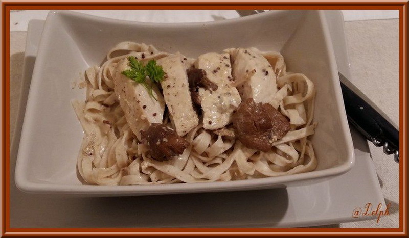 5. Servir la viande nappée de sa crème au cidre, accompagnée des tagliatelles et des petits mousserons.