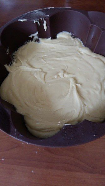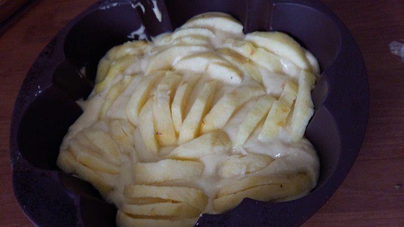 4. Verser la pâte dans un moule silicone. Ajouter les quartiers de pommes ,que l’on dispose en rosace. J’ai saupoudré une peu de sucre roux pour caraméliser le haut du gâteau mais cela est facultatif.