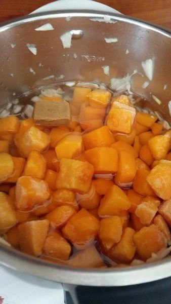 - Éplucher et couper votre potiron en gros carrés, éplucher les pommes de terre et les couper en cubes.