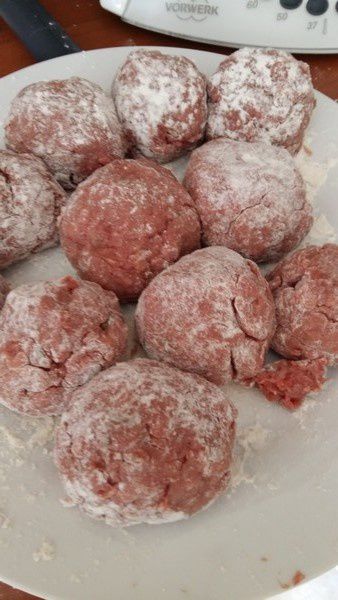 - malaxer le tout à la main et former des boulettes de grosseur égale. ( A la taille d’une balle de golf). Rouler chaque boulette obtenue dans la farine puis verser un filet d’huile d’olive dans une poêle bien chaude et cuisez-les une dizaine de minutes. La cuisson se poursuivra au four.