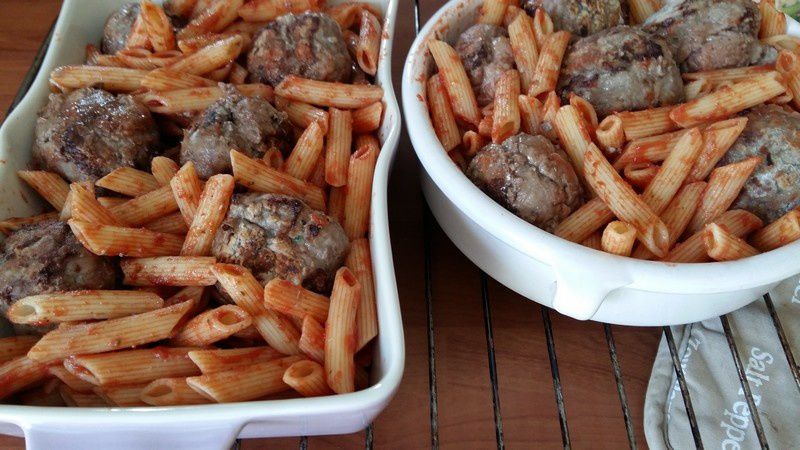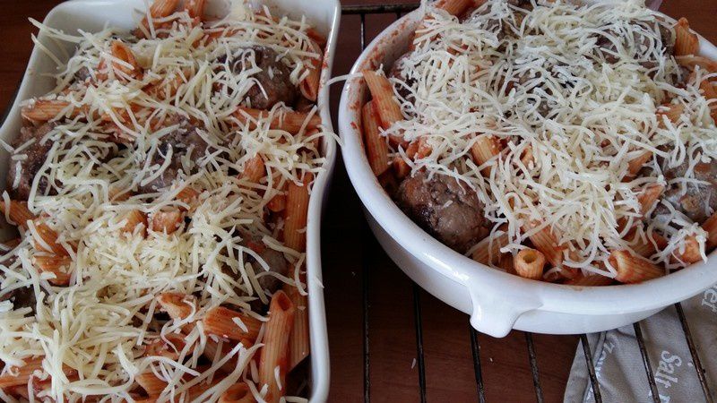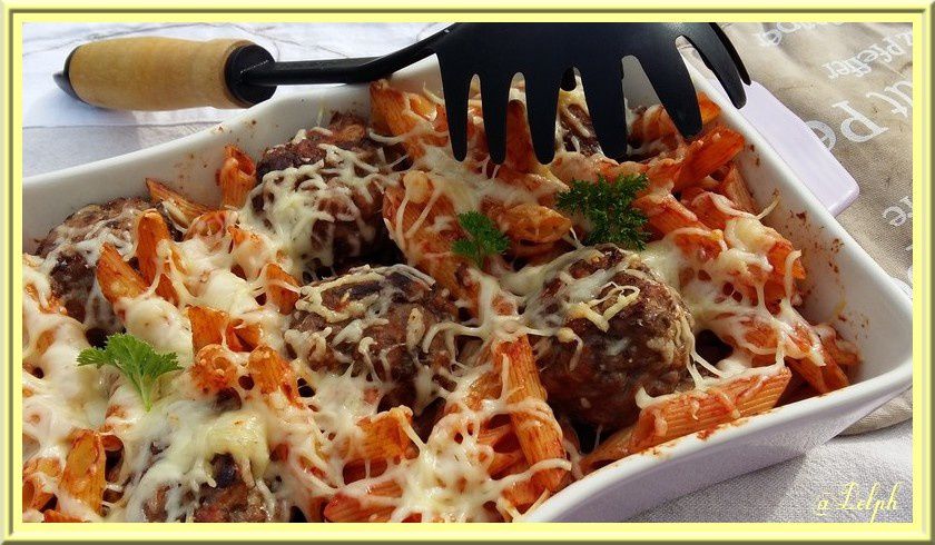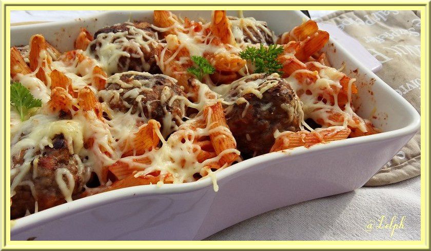- Dans un plat à gratin, disposer les pennes à la tomate et les boulettes de viande puis parsemer de fromage râpé. Enfourner pendant 15 minutes.