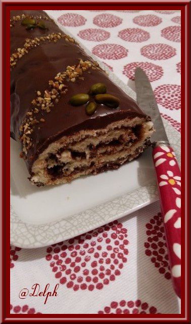 - Dérouler la génoise, garnir de crème puis parsemer le pralin et les éclats de pistache rouler à nouveau le gâteau sur lui-même et le poser sur une grille.