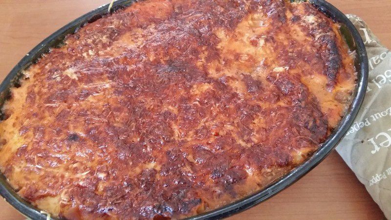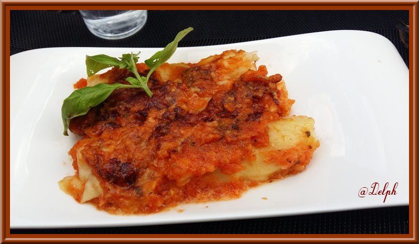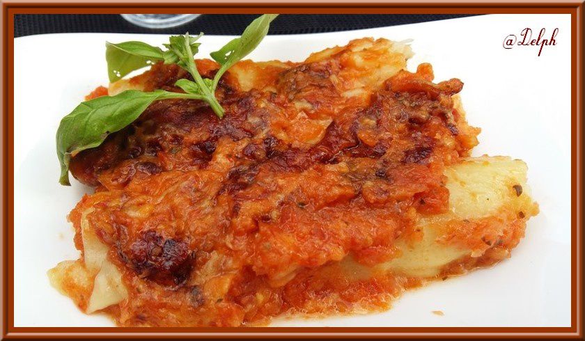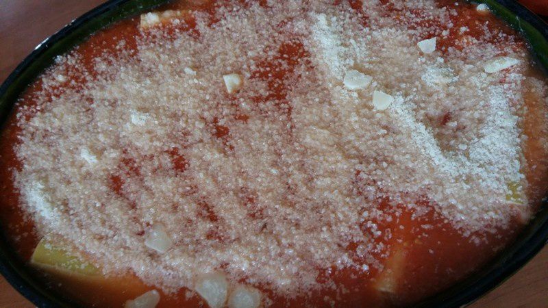 - Disposer les cannellonis dans le plat à gratin et recouvrir de la sauce tomate puis saupoudrer de parmesan.
