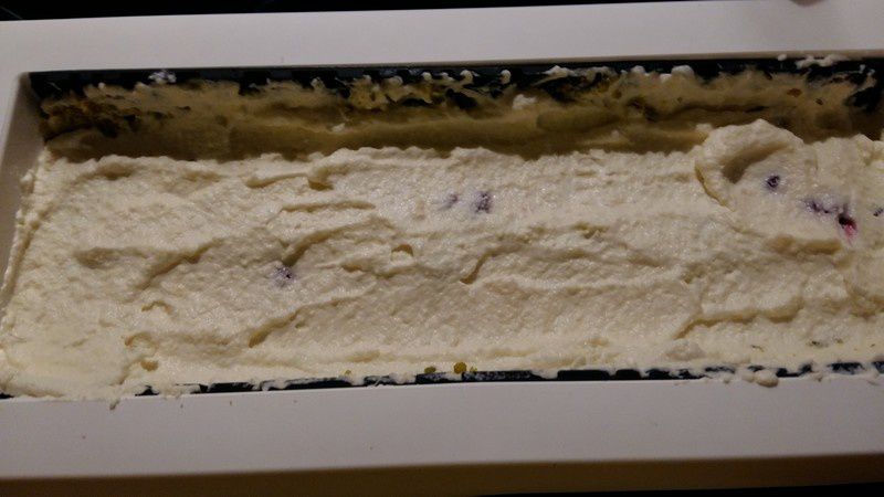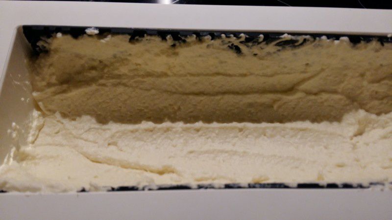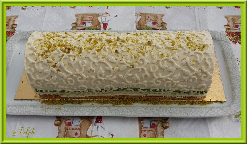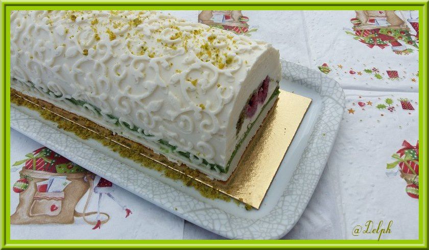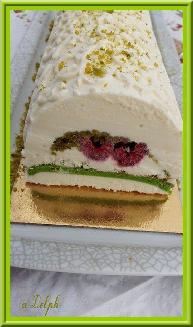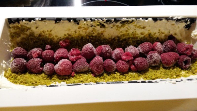 - Mettre votre mousse dans le fond du moule, bien tasser, mettre de la mousse sur les bords à l’aide d’une cuillère, taper votre moule à bûche, sur votre plan de travail pour chasser les bulles d’air, mettre un peu de poudre de pistache, ( en garder 1 càs pour le décor final), poser deux rangées de framboises congelées, sur votre poudre, remettre un peu de crème, mettre votre biscuit Joconde, puis terminer par une nouvelle couche de crème, mettre une nuit au congélateur.