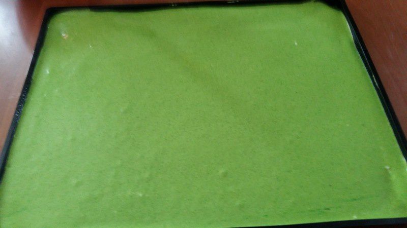 - Étaler le biscuit Joconde sur une feuille de papier cuisson, à l’aide d’une spatule métallique, l’épaisseur doit faire environ 3 mm.