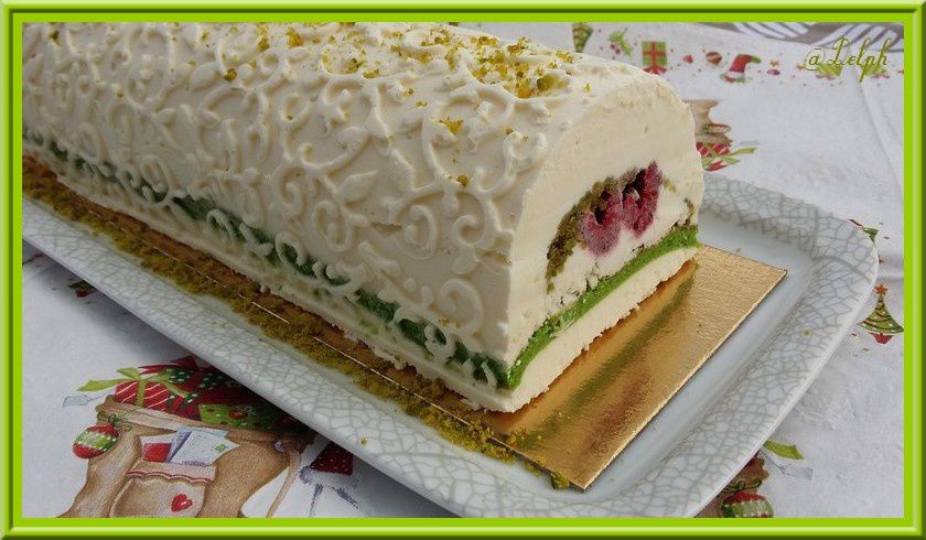 - Mettre votre mousse dans le fond du moule, bien tasser, mettre de la mousse sur les bords à l’aide d’une cuillère, taper votre moule à bûche, sur votre plan de travail pour chasser les bulles d’air, mettre un peu de poudre de pistache, ( en garder 1 càs pour le décor final), poser deux rangées de framboises congelées, sur votre poudre, remettre un peu de crème, mettre votre biscuit Joconde, puis terminer par une nouvelle couche de crème, mettre une nuit au congélateur.