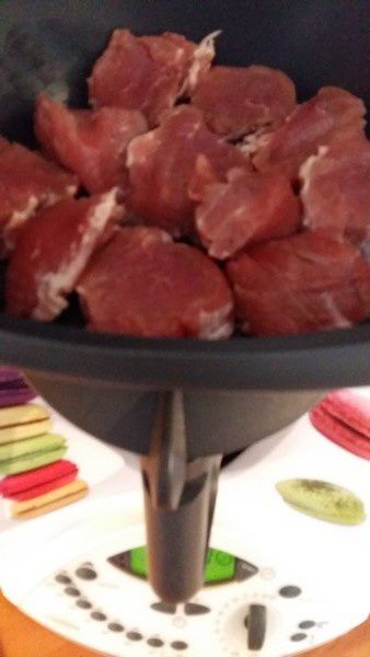 - Découper le filet mignon de porc en dés, les placer dans votre panier Varoma..