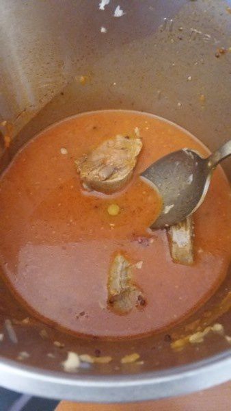 - Ajouter le Nuoc Mam, le chorizo coupé en tranches, le paprika, la moutarde, l’eau, le cube de bouillon, placer le panier Varoma avec la viande sur le couvercle puis programmer 20min/Varoma/Vit mijotage/couteau inversé.