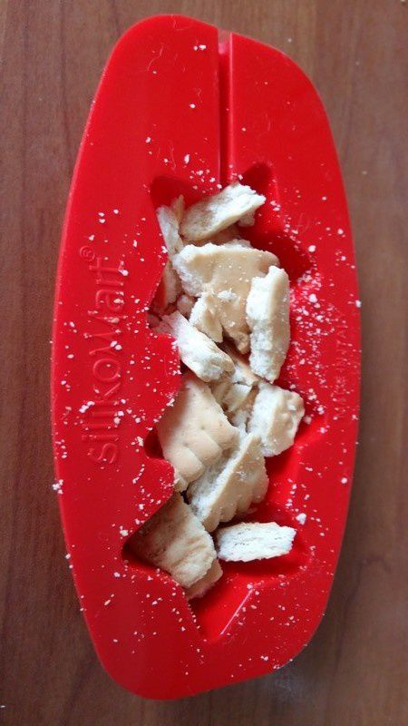 - Casser les biscuits en grosses miettes, garnir les moules en silicone sans tasser.