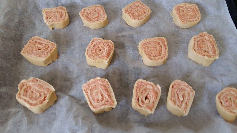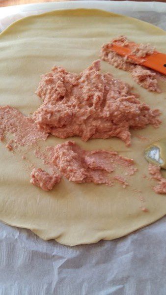 - Repartir le mélange sur la pâte feuilletée et enroulez-la en serrant bien. Mettre au frais pendant 30 minutes afin de raffermir le roulé feuilleté.