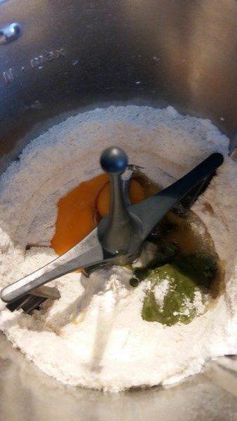 - Mettre la poudre d’amande et le sucre glace dans le bol puis mixer 6sec/Vit5, ajouter la farine, la pistache et deux œufs entiers puis mélanger 5min/Vit3,5 avec le fouet, ajouter l’œuf restant puis poursuivre le mélange 5min/Vit 3,5/ toujours avec le fouet.