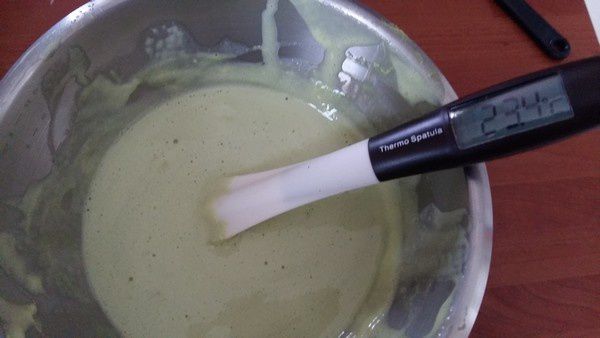 - Réserver dans un cul de poule et faire baisser la température à 23°c, (au réfrigérateur) pour pouvoir incorporer la crème montée.