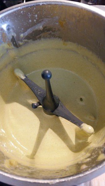 - Lorsque la crème anglaise est bien descendue en température, débloquer l’appareil en mettant une cuillère de crème montée, puis fouetter avec tout le reste.