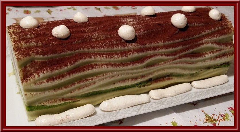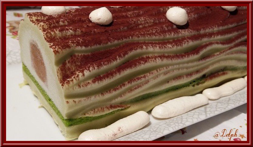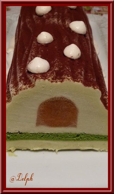 Voici une bûche pleine d’exotisme cette fois-ci. Il faudra la préparer la veille de votre repas de fête car elle demande à rester au congélateur une nuit, puis la sortir environ 2 heures en avance pour qu’elle décongèle. L’insert devra être aussi préparer en avance. J’ai utilisé mon moule Silikomart avec le tapis relief bois..(Encore merci à ma maman pour ce nouveau cadeau).