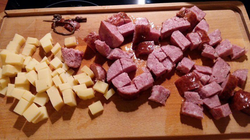- Couper la saucisse en petits dés ainsi que le comté et ajouter le tout à la pâte.
