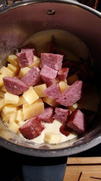 - Couper la saucisse en petits dés ainsi que le comté et ajouter le tout à la pâte, assaisonner plutôt légèrement, puis mélanger 20sec/Vit2/couteau inversé.