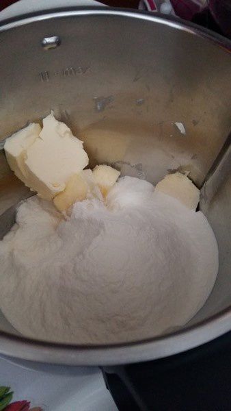 - Mettre le beurre et les sucres dans le bol, puis mixer 20sec/Vit4, ajouter la farine, et l’eau puis mixer 25sec/vit4.