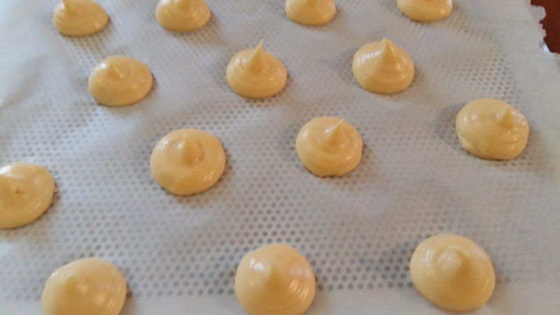 - Dresser la pâte à choux sur une plaque à l’aide d‘une poche à douille lisse n°8, pocher les choux les plus régulièrement possible en quinconce et pas trop rapprochés..
