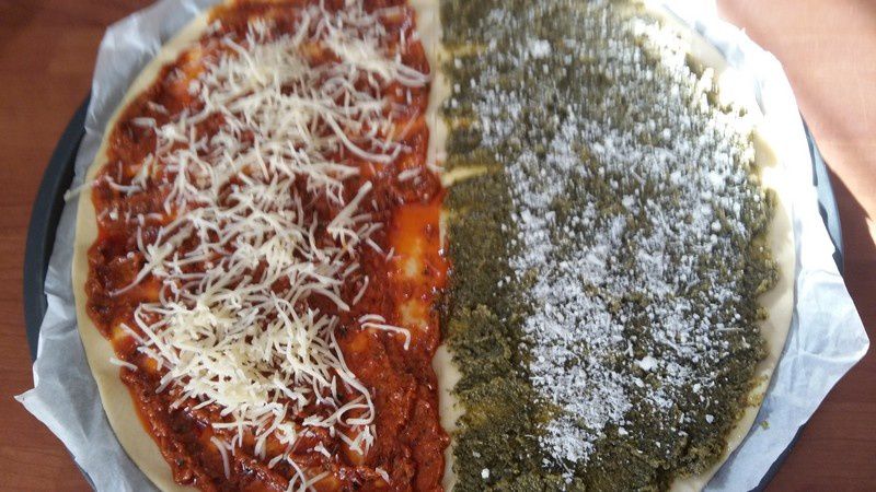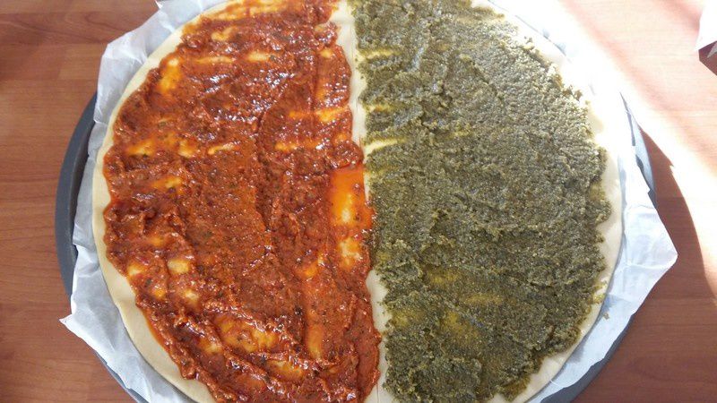 2. Étaler le premier disque de pâte sur un papier cuisson. badigeonner l’ensemble avec la garniture choisie (j’ai fait une moitié sauce Aubergines Poivrons, une moitié pesto).