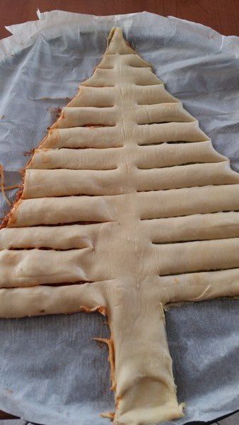 4. Recouvrir du second disque de pâte. Pré-tracer le sapin de la pointe d’un couteau en dessinant un petit tronc et un large triangle. Découper le sapin avec le couteau et enlever le surplus de pâte (conserver le et tailler des petites étoiles feuilletées supplémentaires).