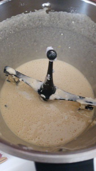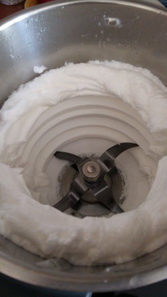 - Mettre les blancs dans le bol et donner deux coups de turbo, insérer le fouet puis programmer 3min/Vit3,5/sans le gobelet doseur. A la sonnerie réserver dans un saladier.