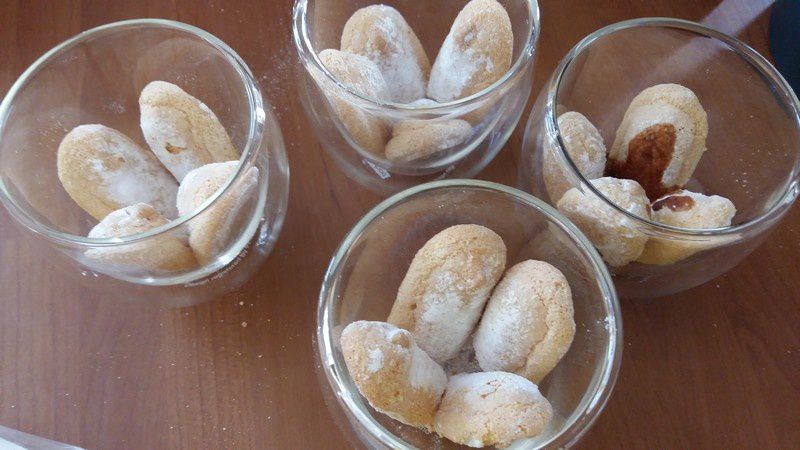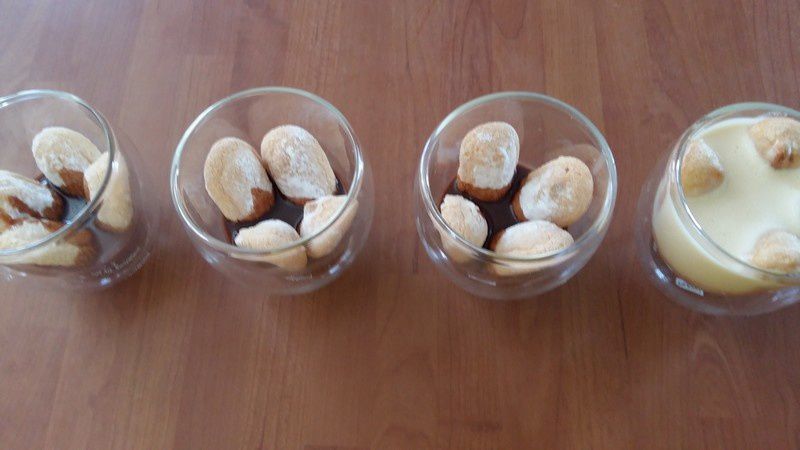 - Disposer les biscuits au fond du plat (ou des verrines), verser dessus la sauce Nutella puis recouvrir de l’appareil au mascarpone.