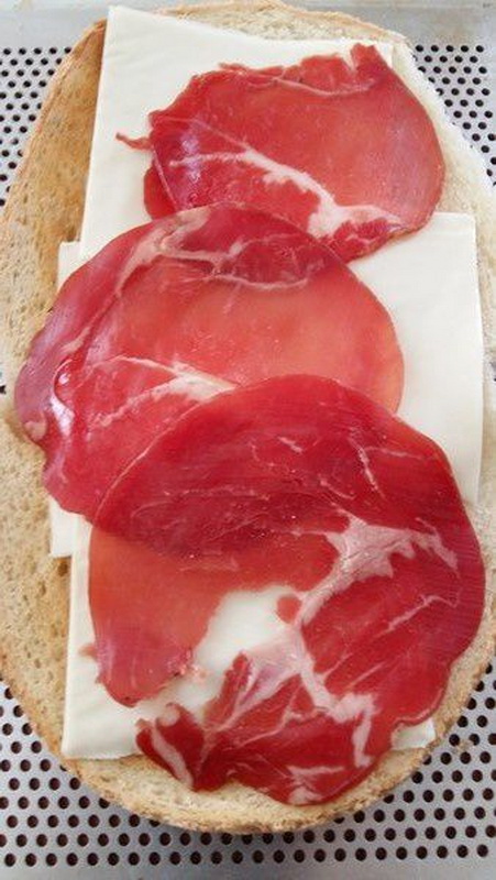 1. Passer votre tartine au grille pain, puis déposer vos tranches de roquefort., vos tranches de Coppa.