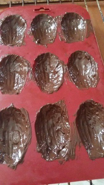 - Ensuite avec un pinceau mettre le chocolat fondu dans les empreintes des moules (lavées et bien séchées) replacer par-dessus les madeleines et mettre au frais environ 1 heure pour que le chocolat se fige.