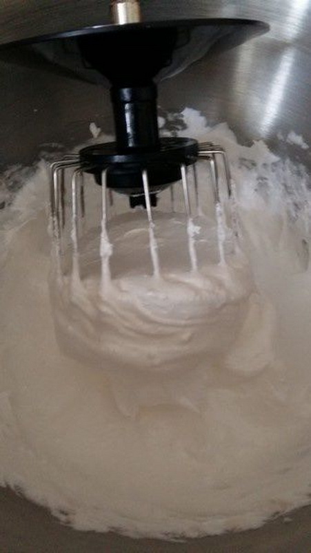 - Mettre l’eau et le sucre dans la casserole, faire cuire jusqu’à 119°c, utiliser une sonde , lorsque celle -ci indique 110°C commencer à monter vos 85g de blancs d’œuf en neige, dès que votre sonde indique 119°C, verser en filet votre sucre chaud sur les blancs, attention de bien se mettre contre la paroi du bol, vos blancs doivent toujours tourner, baisser un peu le rythme, puis lorsque vous avez tout mis, augmenter la puissance et continuer à tourner environ 7 minutes.