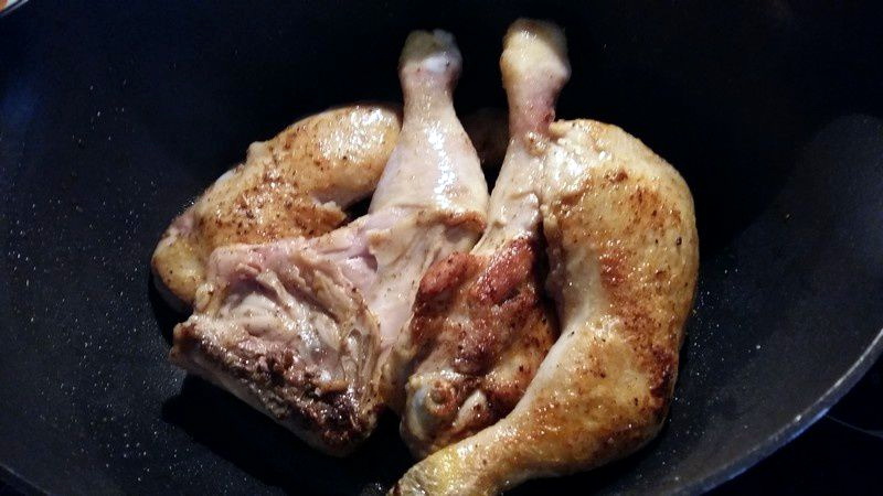 - Remettre les cuisses de poulet. Couvrir et cuire à feu doux 45 minutes.