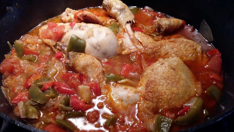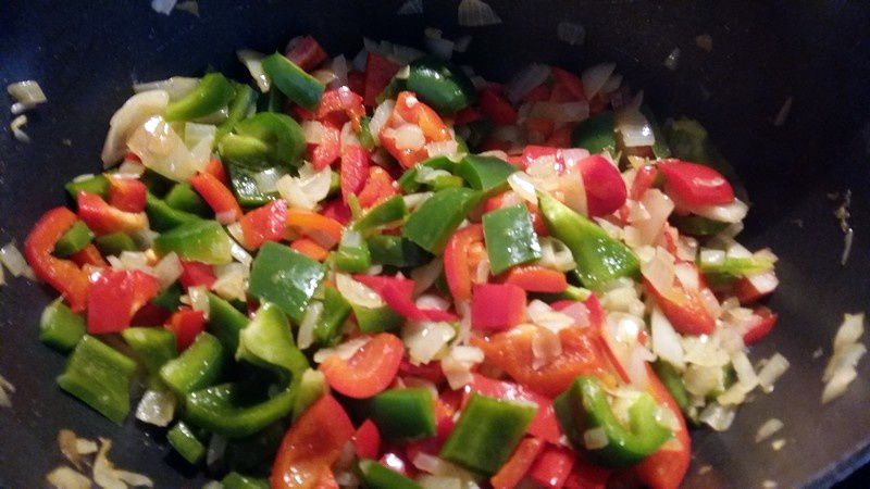 - Mettre à la place les oignons et l’ail. Les faire suer 5 minutes à feu doux. Ajouter les poivrons. Cuire à feu doux 5 minutes en remuant. Ajouter les tomates, le bouquet garni, le concentré dilué dans un verre d’eau tiède.