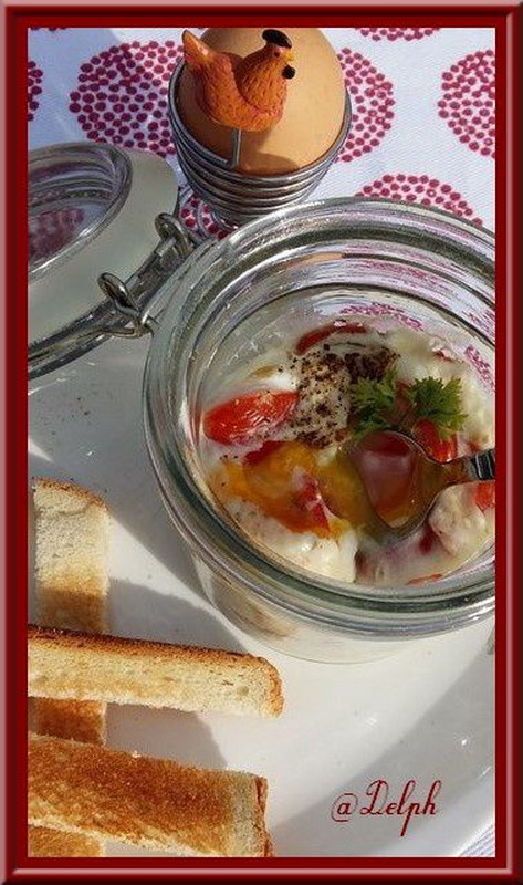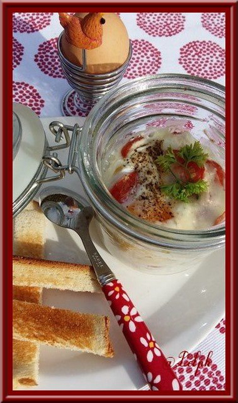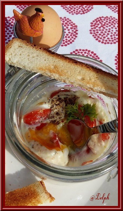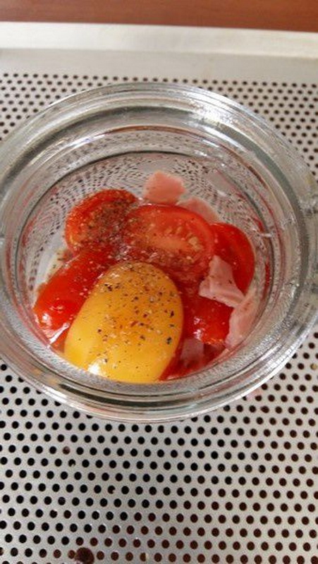 - Rajouter les dés de bacon, les tomates cerises et les oignons frits. Poivrer. Puis casser un œuf dans le ramequin.