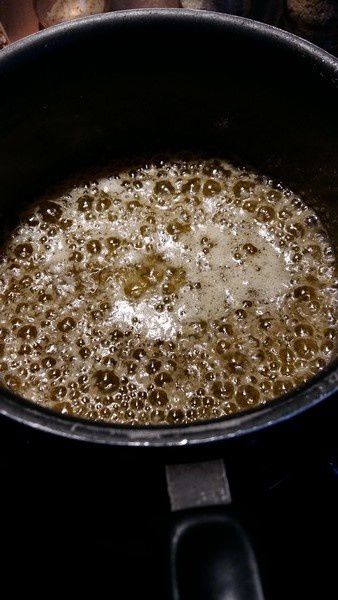 - Faire fondre le beurre dans une casserole jusqu’à obtenir une couleur noisette, ajouter le beurre à la préparation, utiliser une petite passoire pour enlever toutes les impuretés du beurre.