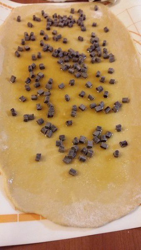- Étaler dessus le beurre fondu mélangé au sucre, saupoudrer de pépites de chocolat, rouler en un boudin. Couper le boudin en 2. (voir photographies)