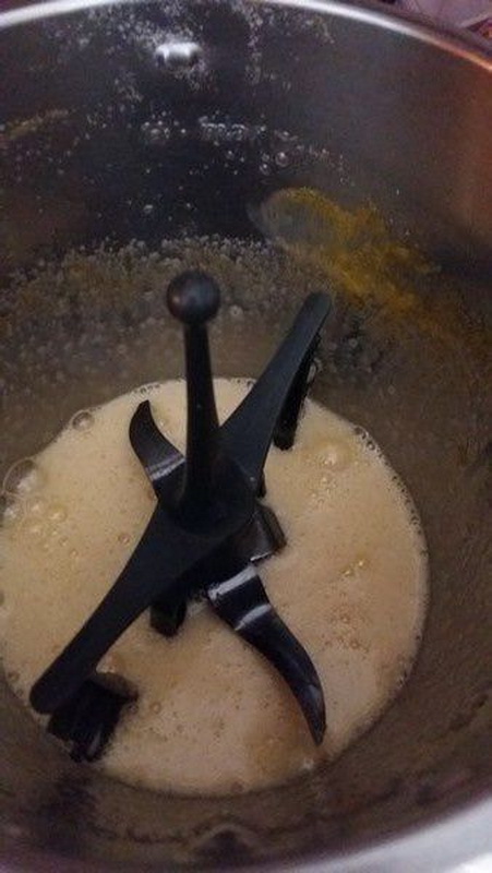 - Gratter votre gousse de vanille pour récupérer les graines les incorporer au précédent mélange avec le beurre fondu et la vanille liquide puis mélanger à nouveau 20sec/Vit4.
